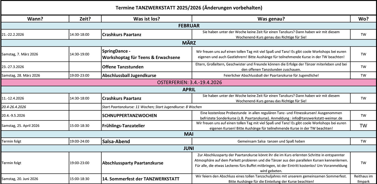 Hier können Sie schonmal die geplanten Veranstaltungen, Ferien oder Auftritte einsehen und sich Wichtiges in Ihrem Kalender notieren!